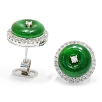 Indulge in opulence with our 18W Jadeite Bi-Disk Earrings, a masterpiece for those who appreciate luxury and style. These earrings feature a stunning 6.86ctw of vibrant green jadeite, elegantly complemented by a halo of 0.66ctw dazzling diamonds, creating a breathtaking sparkle. Certified by GIA, HKGL, and MK, these earrings promise authenticity and superior quality.