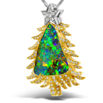 The opal is elegantly framed by a gold Christmas tree design, encrusted with sparkling diamonds that glisten like freshly fallen snow.