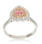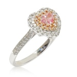 The ring is accented with a total of 74 diamonds, with the diamond accents totaling 0.42 carats. The layered halo design draws the eye to the heart-shaped pink diamond while adding sparkle from every angle.